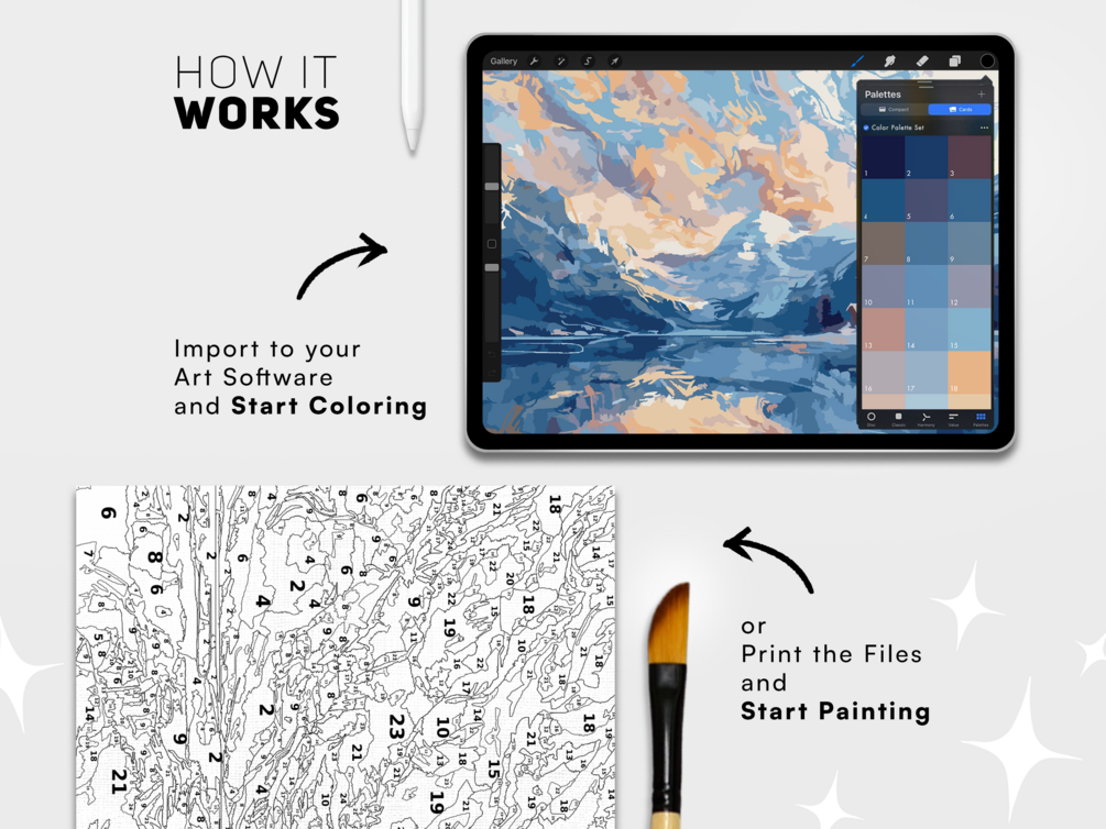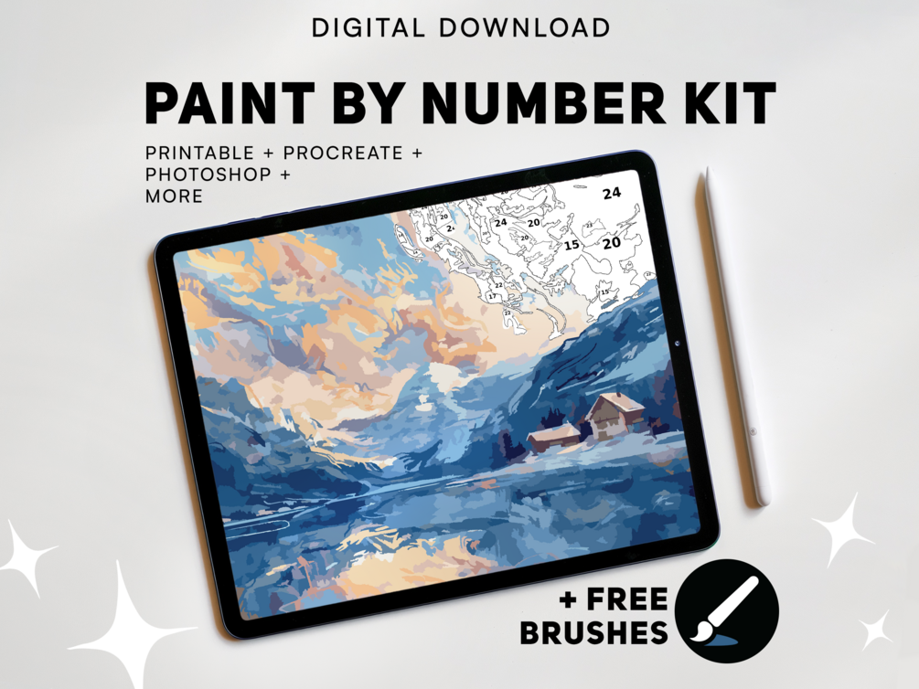 Explore the joy of digital paint by number with this Snowy Lake Scene Painting Kit. Paint on Procreate, Fresco, Photoshop, etc OR print the files and paint by hand. Use your creation as a printable art, decorative display, or wallpaper. Instantly access the files and unleash the artist inside you!