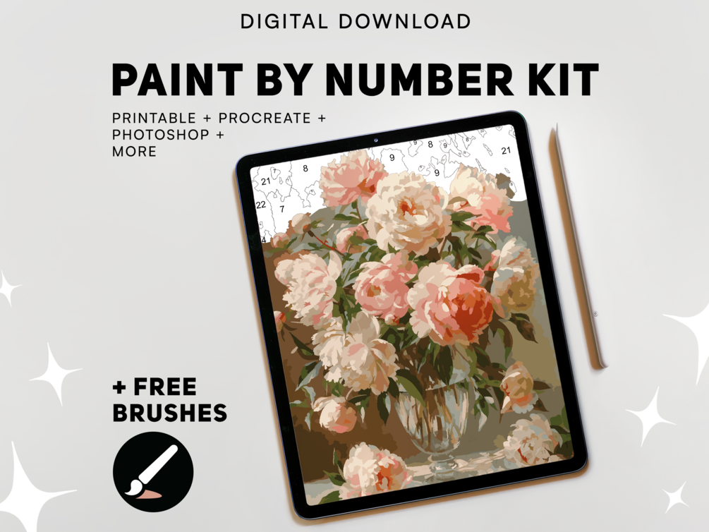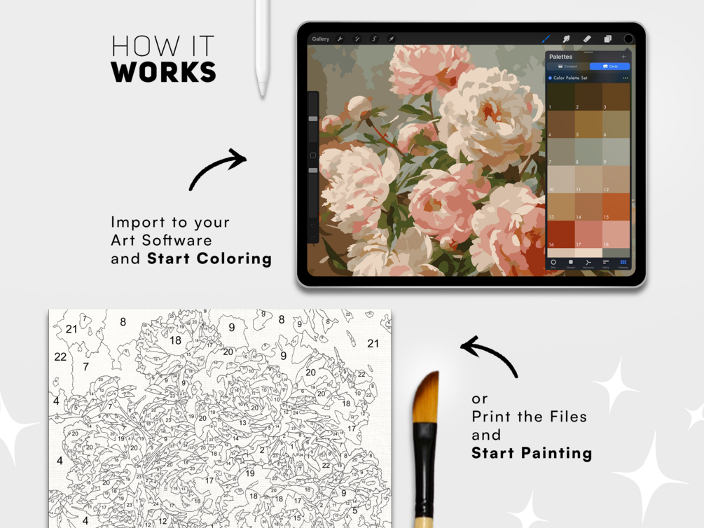 Explore the joy of digital paint by number with this Flower Painting Kit. Paint on Procreate, Fresco, Photoshop, etc OR print the files and paint by hand. Use your creation as a printable art, decorative display, or wallpaper. Instantly access the files and unleash the artist inside you!