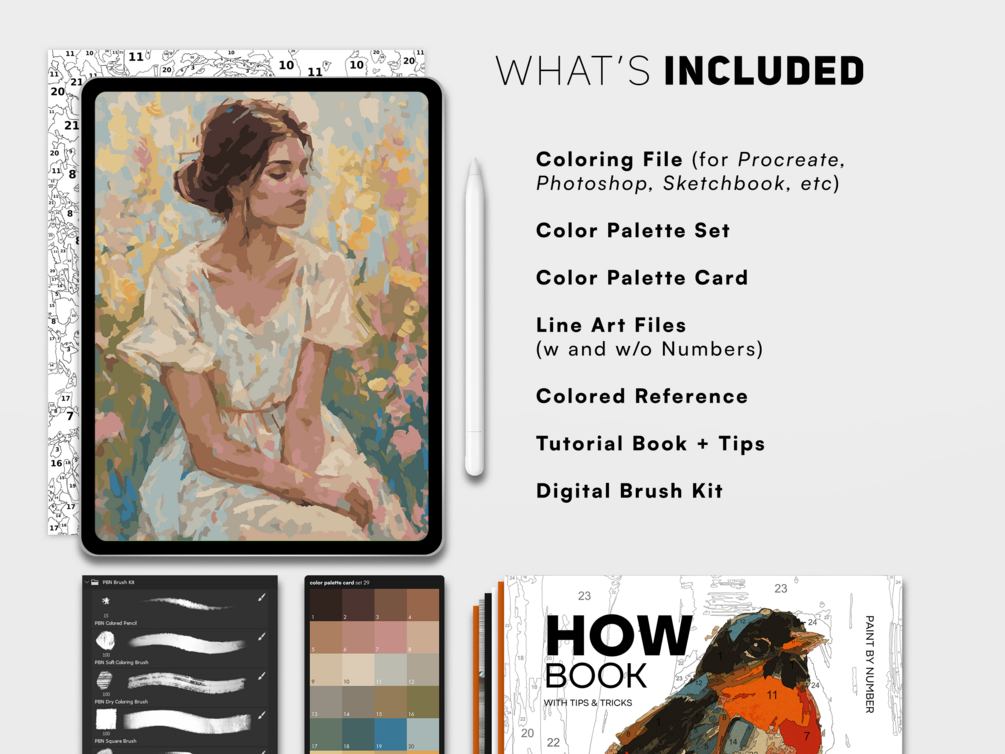 Explore the joy of digital paint by number with this Girl in a Field Painting Kit. Paint on Procreate, Fresco, Photoshop, etc OR print the files and paint by hand. Use your creation as a printable art, decorative display, or wallpaper. Instantly access the files and unleash the artist inside you!