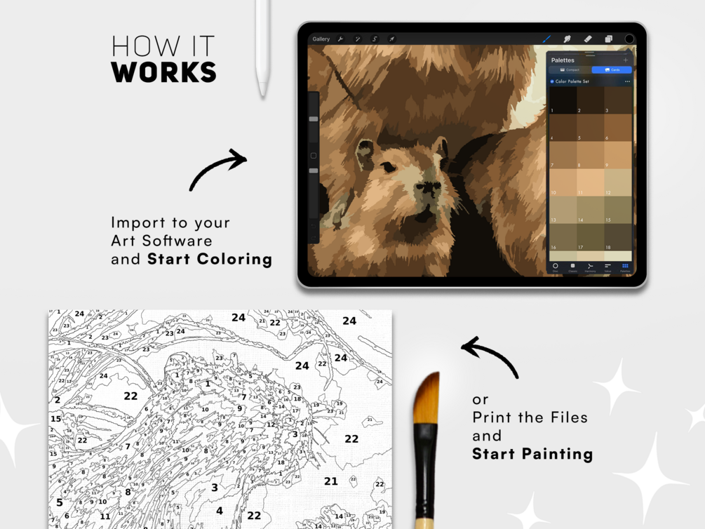 Explore the joy of digital paint by number with this Capybara Painting Kit. Paint on Procreate, Fresco, Photoshop, etc OR print the files and paint by hand. Use your creation as a printable art, decorative display, or wallpaper. Instantly access the files and unleash the artist inside you!