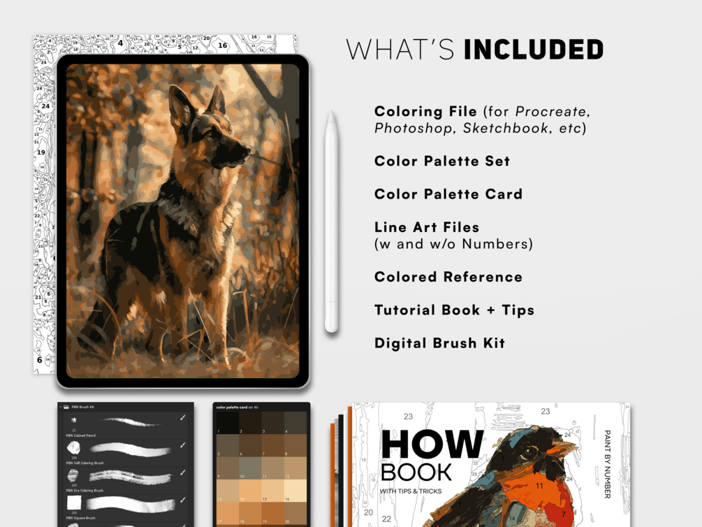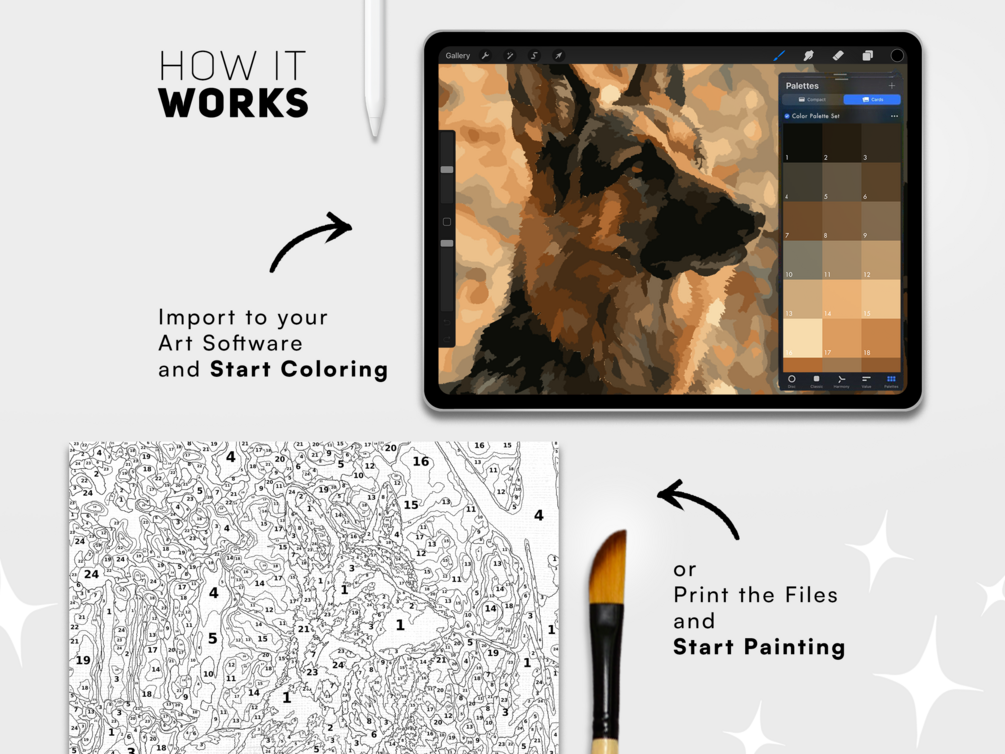 Explore the joy of digital paint by number with this German Shepherd Painting Kit. Paint on Procreate, Fresco, Photoshop, etc OR print the files and paint by hand. Use your creation as a printable art, decorative display, or wallpaper. Instantly access the files and unleash the artist inside you!
