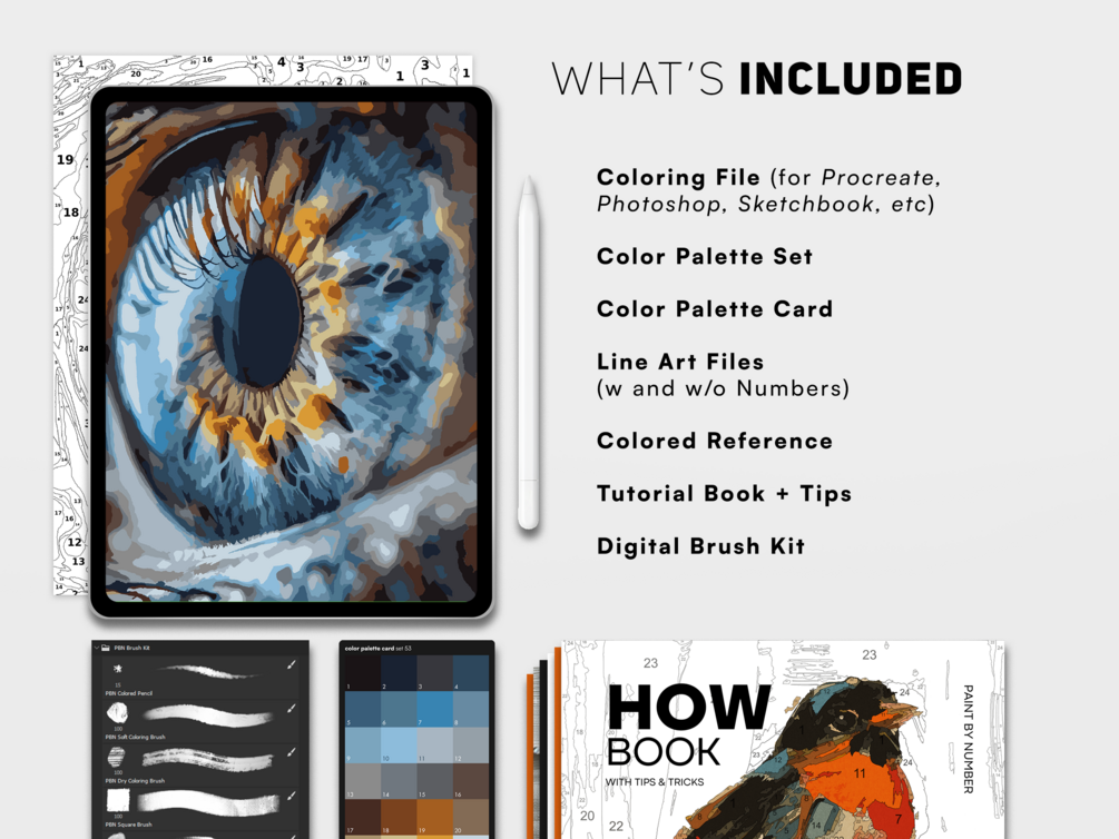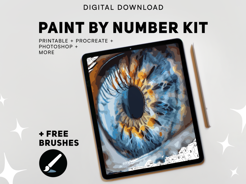 Explore the joy of digital paint by number with this Abstract Eye Painting Kit. Paint on Procreate, Fresco, Photoshop, etc OR print the files and paint by hand. Use your creation as a printable art, decorative display, or wallpaper. Instantly access the files and unleash the artist inside you!