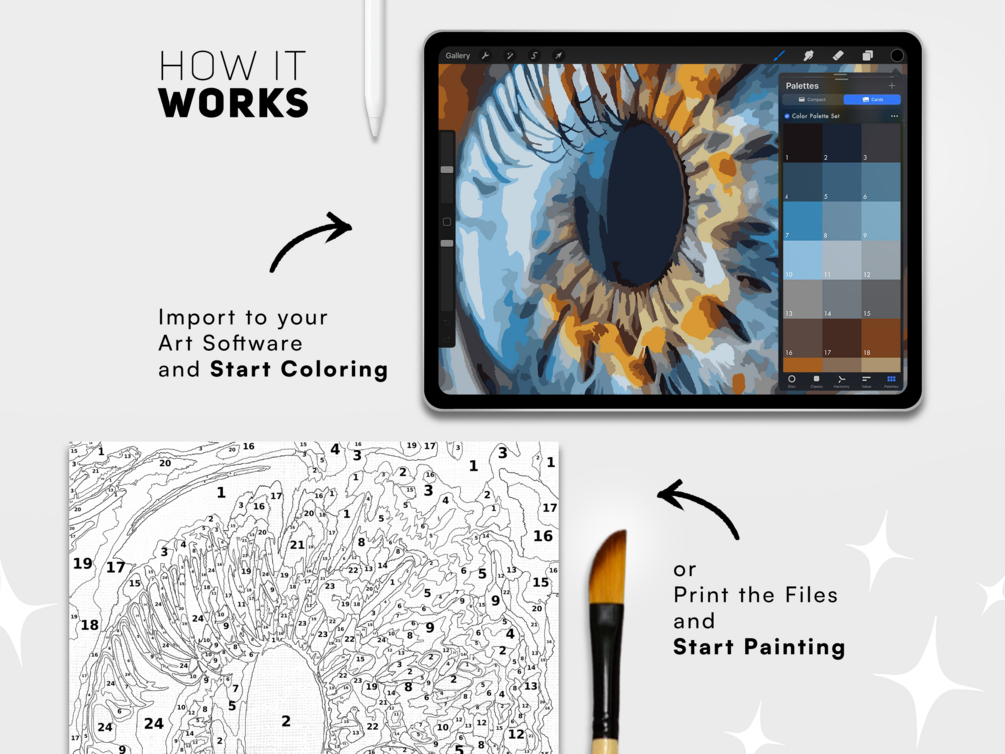 Explore the joy of digital paint by number with this Abstract Eye Painting Kit. Paint on Procreate, Fresco, Photoshop, etc OR print the files and paint by hand. Use your creation as a printable art, decorative display, or wallpaper. Instantly access the files and unleash the artist inside you!