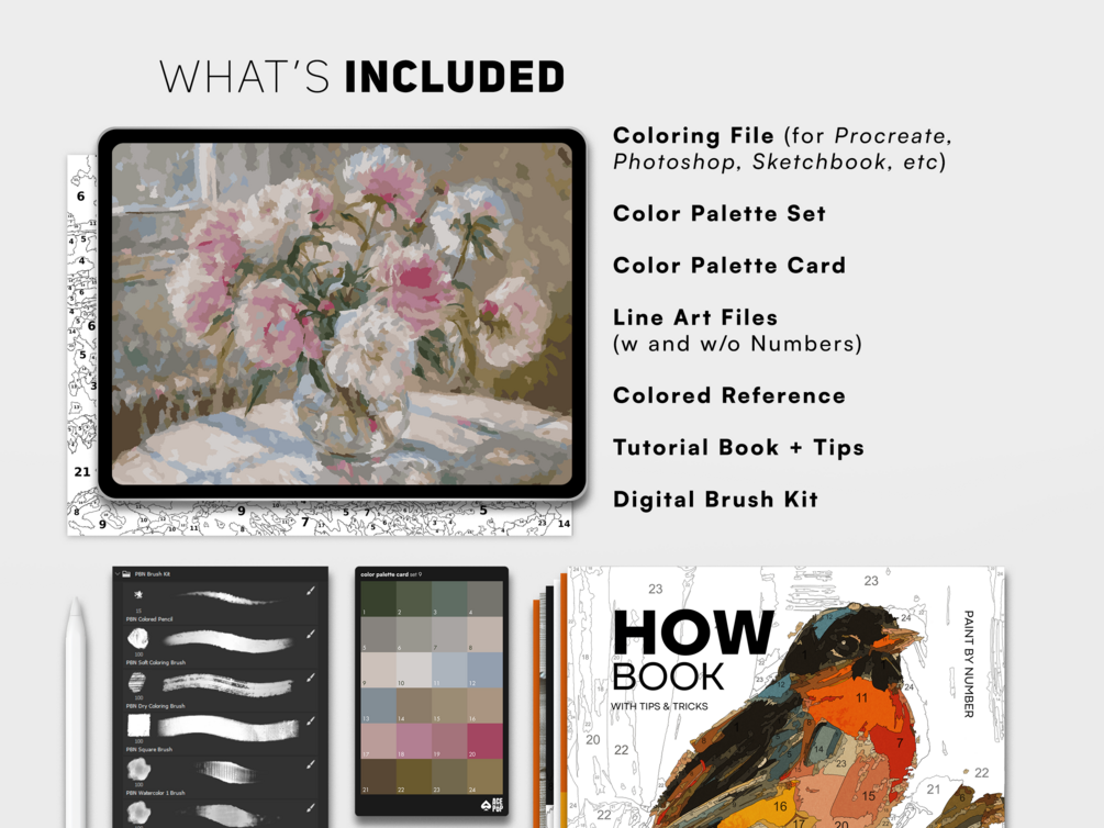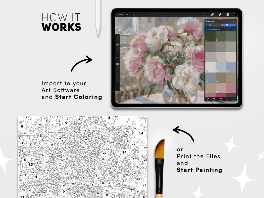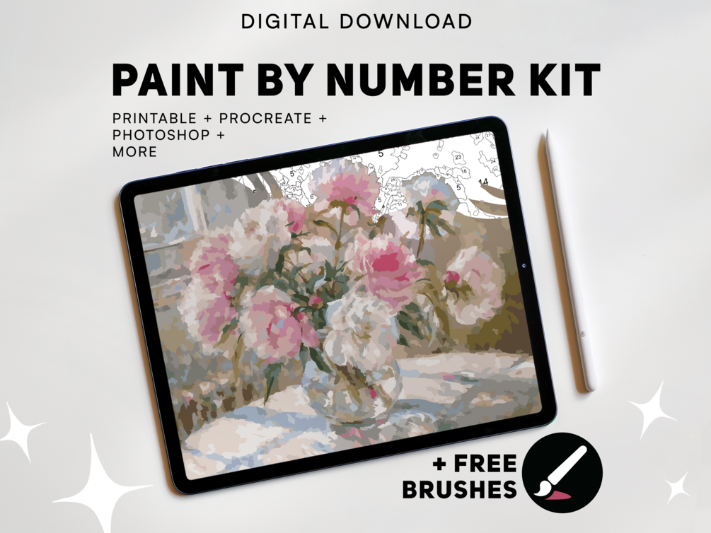 Explore the joy of digital paint by number with this Flower Vase Painting Kit. Paint on Procreate, Fresco, Photoshop, etc OR print the files and paint by hand. Use your creation as a printable art, decorative display, or wallpaper. Instantly access the files and unleash the artist inside you!